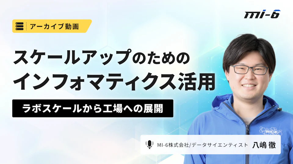 本セミナーでは、MI-6のデータサイエンティストの八嶋より、製品のスケールアップ・プロセス検討におけるインフォマティクス活用の概要についてお話させていただきます。