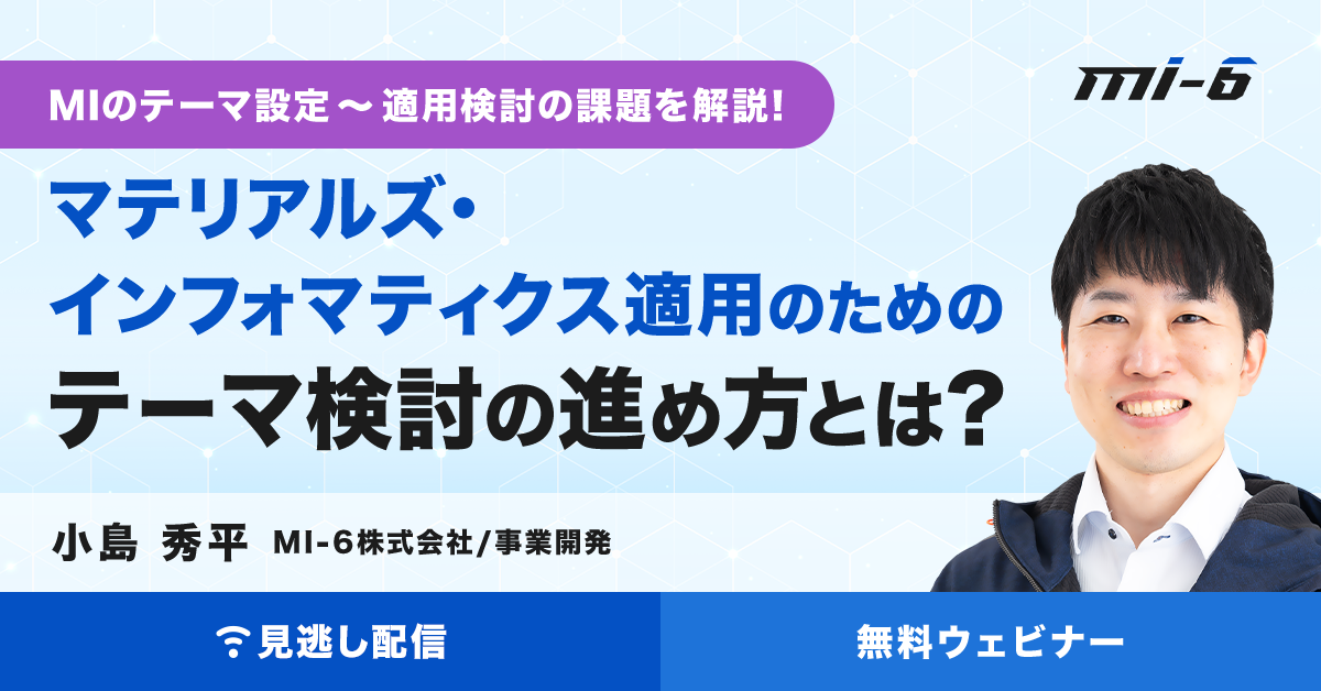 研究開発領域におけるデジタル・トランスフォーメーション(DX)の1つとして、マテリアルズ・インフォマティクス(MI)に注目が集まっています。MIを始めるにあたって、自社の研究テーマに対して、どのテーマがMIの検討に適しているのか?(ないし適さないのか)、どういう状態であれば検討が進められるのか?、そもそもMIにおけるテーマ設定〜適用検討をどのようにすすめたらよいのか?などの課題が多く見受けられます。