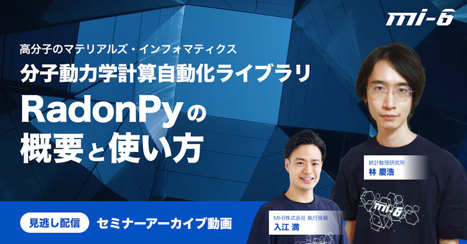 本セミナーでは、弊社の技術顧問である統計数理研究所の林慶浩先生をお招きし、高分子マテリアルズ・インフォマティクスのための分子動力学(MD)計算自動化ライブラリ「RadonPy」についてご紹介いただきます。
