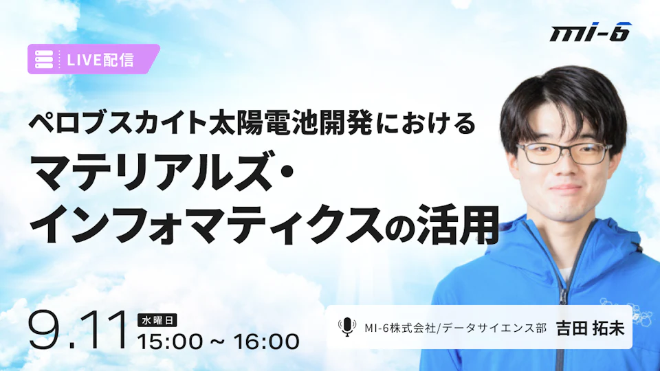 持続可能な社会の実現に向けて、太陽電池は太陽光発電における中心的な要素として注目されています。その中でもペロブスカイト太陽電池は次世代の太陽電池として非常に注目されており、研究開発が盛んに行われています。しかし、さまざまな企業や大学で研究が進められているものの、実用化にはまだまだ課題も多く残っているのが現状です。本セミナーでは、ペロブスカイト太陽電池の概要やその開発における課題に対してマテリアルズ・インフォマティクスでどのようなアプローチが取れるのかという点についてご説明します。