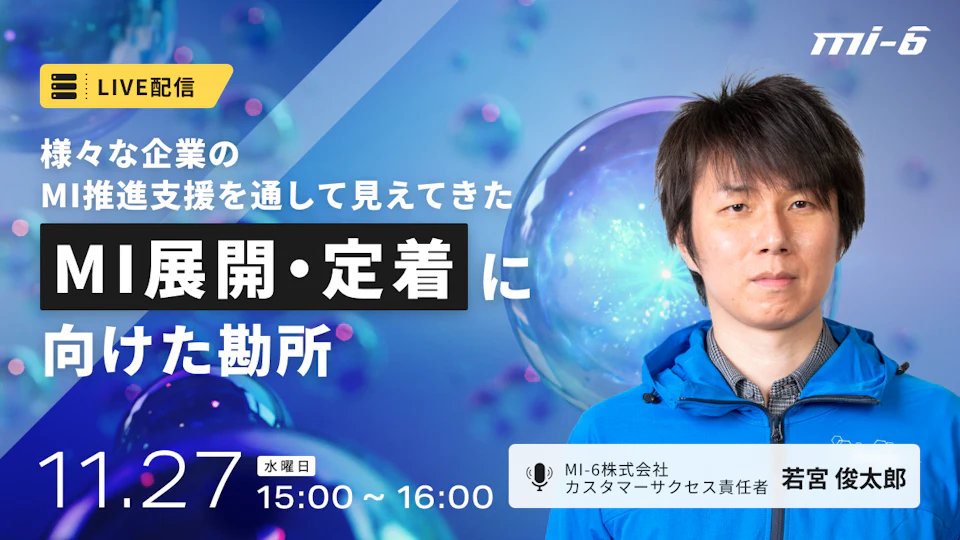 一方、全てが一品一様な要素ではなく、共通項部分も明確になってきています。本セミナーでは、100社以上の顧客への実験計画プラットフォームmiHub®の提供ならびにMI推進支援を通じて見えてきた、効果的なMI実践・展開・定着に向けての要素をご紹介いたします。