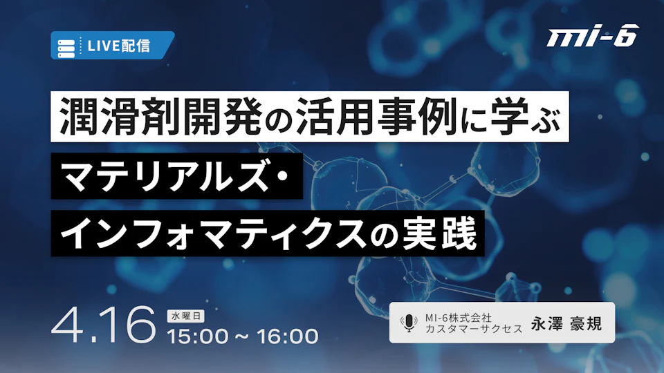 本セミナーでは、潤滑油開発テーマを例に、MIの活用事例をご紹介します。配合設計、特性予測、要因分析といった開発プロセスにおいて、MIがどのような場面で効果を発揮するのか、実践的な視点でお伝えします。潤滑剤開発に携わる方々のデータ活用に向けた第一歩として、ぜひご参加ください。