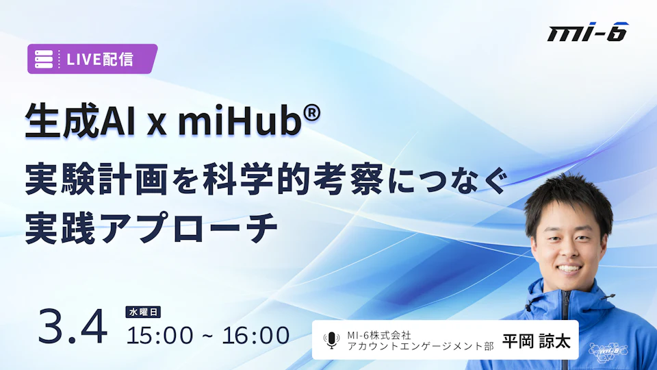 本ウェビナーでは、生成AIやmiHub®︎の機能紹介に留まらず、企業の研究開発支援を通じて蓄積してきたナレッジや実例をもとに、生成AIとmiHub®︎を実務で有効活用していく際の考え方を解説します。