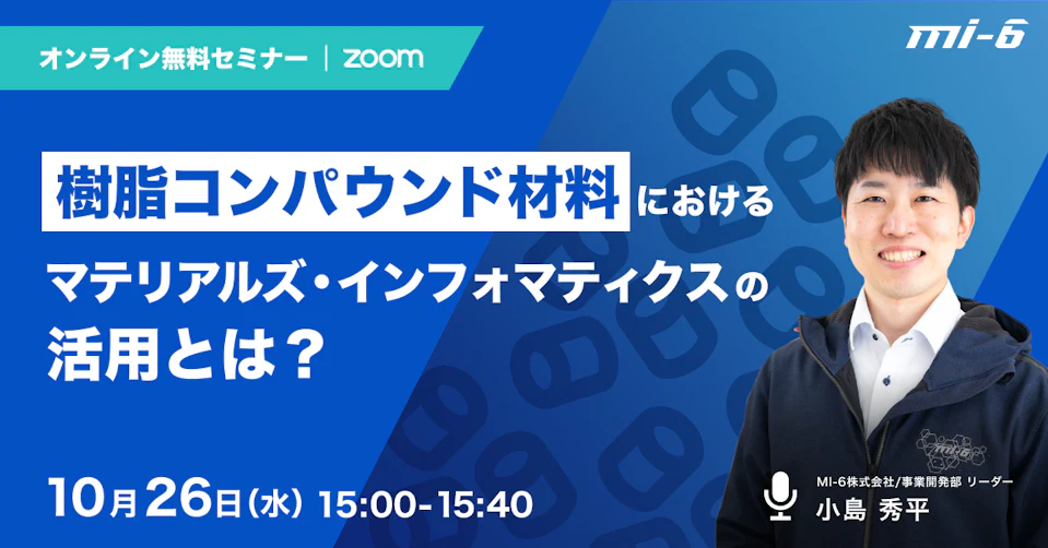 本セミナーでは、MI-6の事業開発部 リーダーの小島より、樹脂コンパウンド材料でのマテリアルズ・インフォマティクス活用についてお話させていただきます。