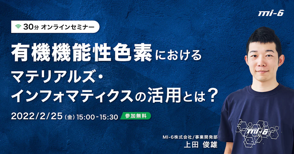 本セミナーでは、有機機能性色素の研究経験のある、MI-6の事業開発部の上田より、有機機能性色素におけるマテリアルズ・インフォマティクス活用についてお話させていただきます。