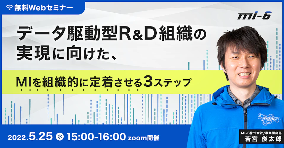 本セミナーでは、数多くの企業のMI推進事例を見てきたMI-6の事業開発部の若宮より、データ駆動型R&D組織の実現に向け、MIに関する取り組みを、どのように点から面的な活動に広げ、組織的に定着させていけばいいのかについてお話させていただきます。