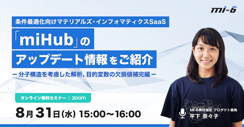 本セミナーでは、実験条件最適化に特化したマテリアルズ・インフォマティクスのSaaSサービスであるmiHub®(エムアイハブ)の直近のアップデート機能ー 「分子構造を考慮した解析」「実験失敗時における欠損値の自動補完(目的変数の欠損値補完) 」を中心に、miHub®についてご紹介致します。