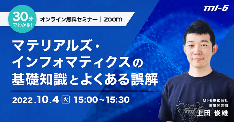本セミナーでは、MI-6の事業開発部の上田より、マテリアルズ・インフォマティクスの基礎知識と、よくある誤解について、お話させていただきます。