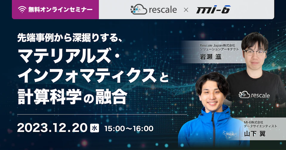 本セミナーでは、MIの解析サービスやソフトウェアを提供するMI-6と、シミュレーション環境の構築が可能であるHPC(ハイパフォーマンスコンピューティング)プラットフォームを提供するRescaleより、マテリアルズ・インフォマティクスと計算科学を組み合わせた取り組みについてお話しさせていただきます。