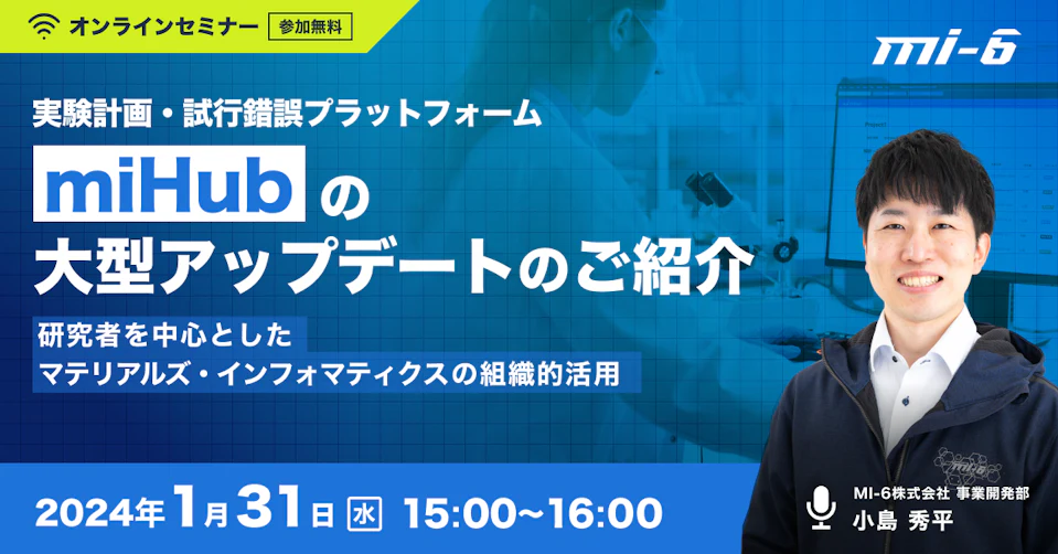 本セミナーでは、数多くの企業のMI推進をご支援しているMI-6の事業開発部の小島より、実験条件検討・最適化に特化したソフトウェア・サポート事業であるmiHub®について、大型アップデート内容である「実験点検討」や「試行錯誤プラットフォーム」を中心にご紹介します。