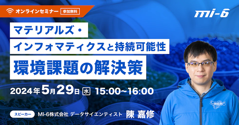 本セミナーでは、溶媒の環境負荷と生分解性有機材料開発におけるMIの活用例について、環境持続可能性への適応も合わせて、高分子材料の研究経験のある、MI-6のデータサイエンティストの陳よりお話させていただきます。