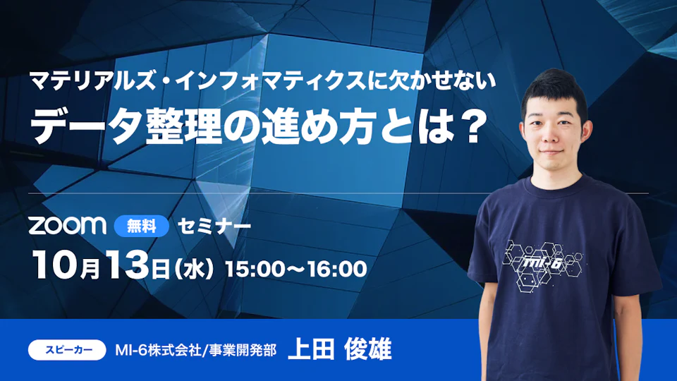 本セミナーでは、MI専業企業として多くの企業のMI導入をご支援してきた立場から、企業におけるデータ整理の現状や、素材組成・プロセス条件の最適化を対象とした場合に、どのようにデータを整理していけばMI導入が始められるか、といったMI導入の第一歩目についてお話させていただきます。