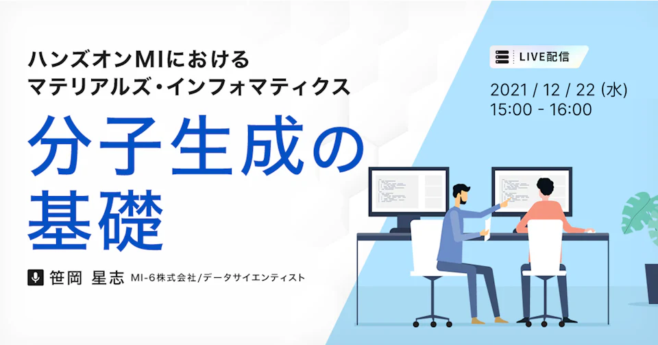 本セミナーでは、MI-6のデータサイエンティストより、MI専業企業として多くの企業のMI導入をご支援してきた立場から、各社向けにカスタマイズしたマテリアルズ・インフォマティクスを実施するハンズオンMIにて用いられる、分子生成に関する技術とその概要についてお話させていただきます。