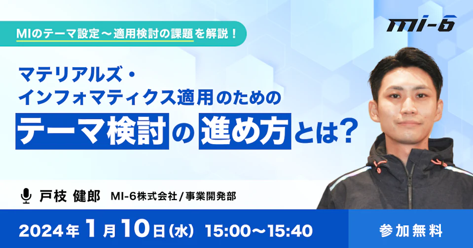 本セミナーでは、MI-6の戸枝より、MI適用テーマ検討の進め方、確認すべきポイントや、一例として弊社で実施しておりますテーマ相談の流れについてお話させていただきます。