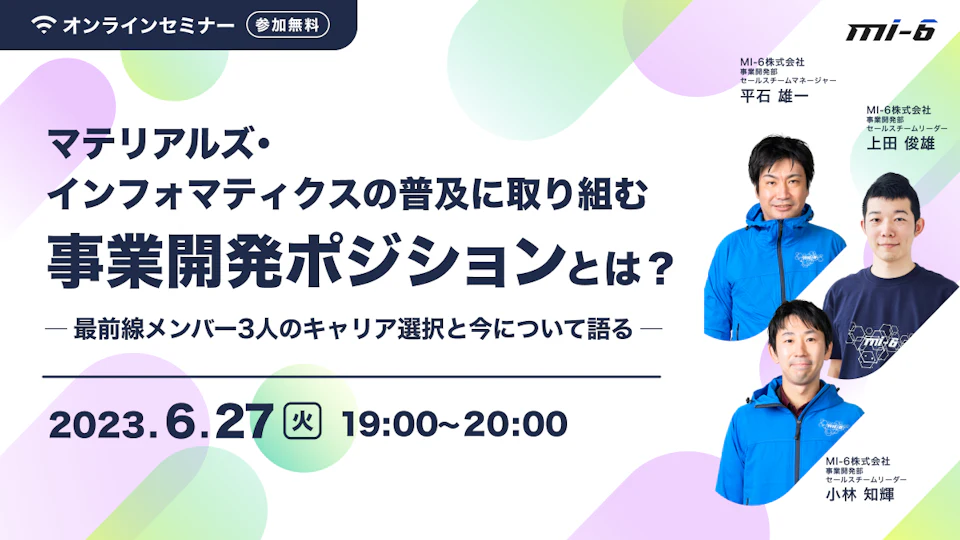 化学業界や化学専攻を中心に様々な経歴を持ったメンバーが集まるMI-6のSalesチーム。なぜ彼らはMI-6を次のキャリアとして選んだのか?登壇するパネリストのこれまでのキャリアについて深掘りしながら、三者三様のストーリーを紐解いていきます。
