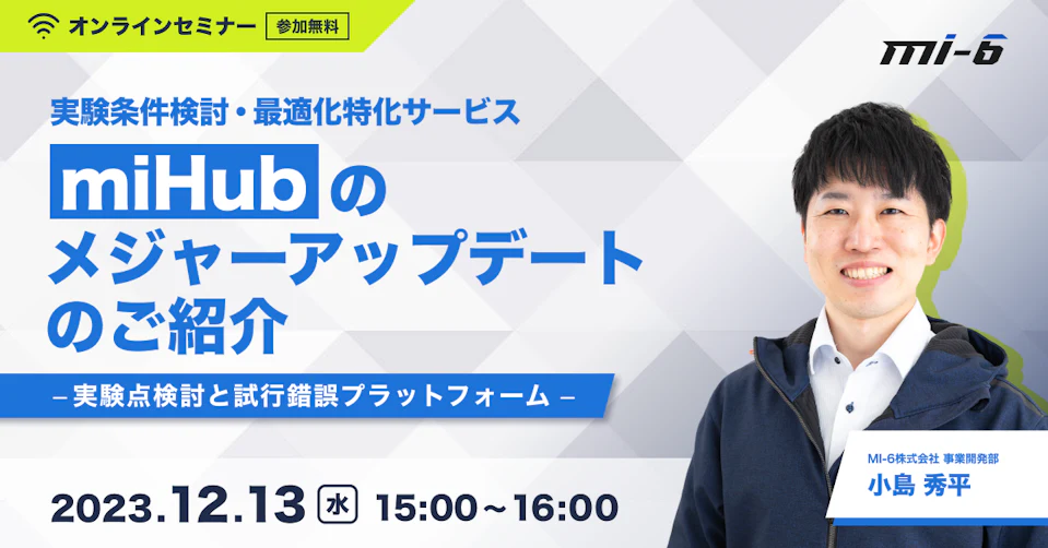 本セミナーでは、数多くの企業のMI推進をご支援しているMI-6の事業開発部の小島より、MI活用・定着におけるポイントや、実験条件検討・最適化に特化したソフトウェア・サポート事業であるmiHub®について、大型アップデート内容として、実験点検討と、試行錯誤プラットフォームについてお話させていただきます。
