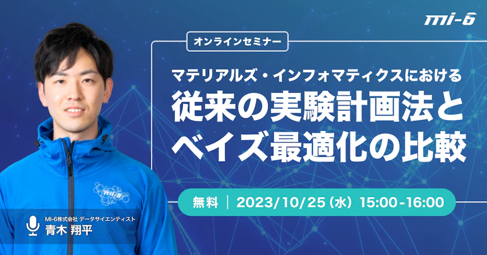 本セミナーでは、MI-6のデータサイエンティストの青木より、実験条件最適化に特化したマテリアルズ・インフォマティクスのSaaSであるmiHub®(エムアイハブ)でも採用しているベイズ最適化と実験計画法の違いについて、ショートセミナーにてお話させていただきます。